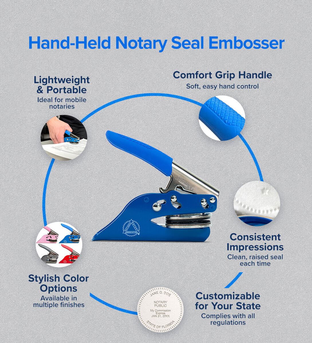 The soft rubber grip and steel-reinforced handle offer unmatched comfort and durability. Use it alone or pair it with a Notary seal stamp.