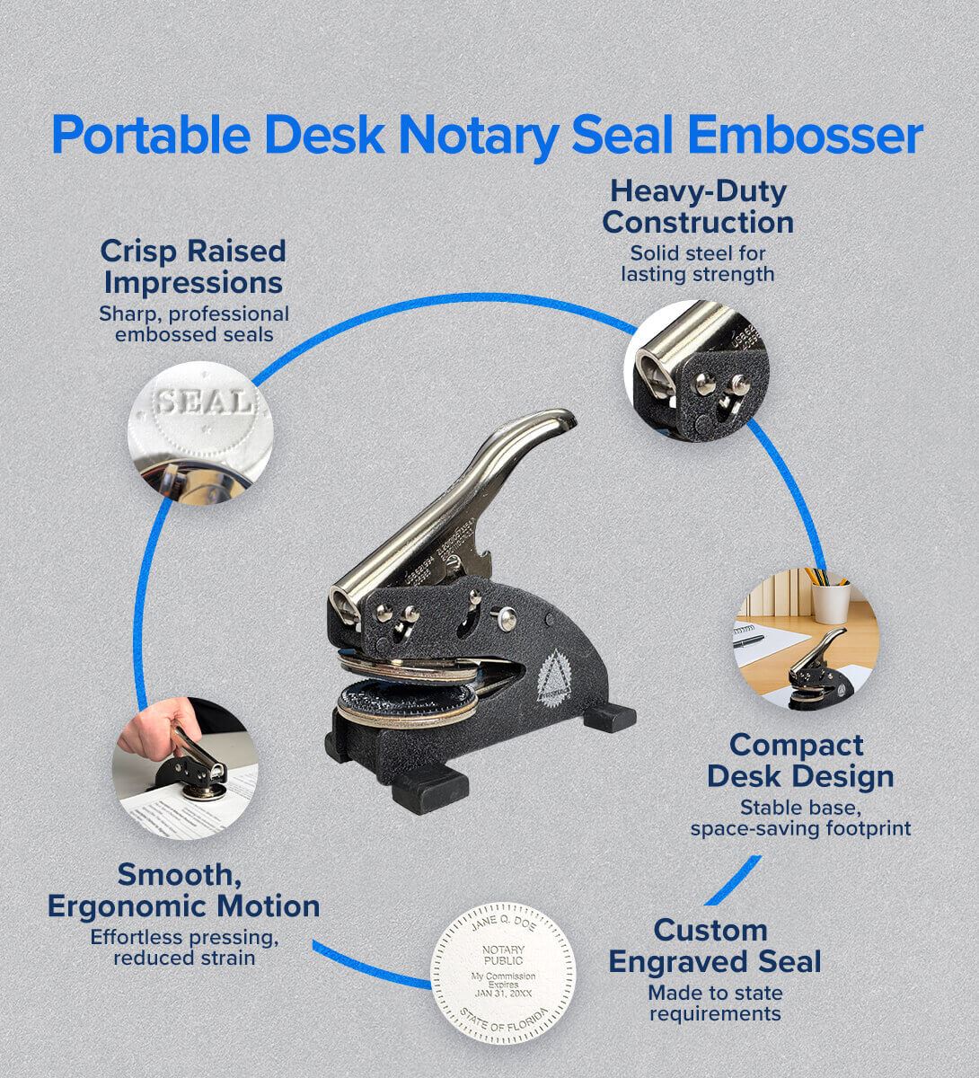 The Portable Desk Notary Seal Embosser delivers a crisp, clear impression every time. Its sturdy metal clamping mechanism creates a 1-5/8" seal that displays your official Notary Public commission information.